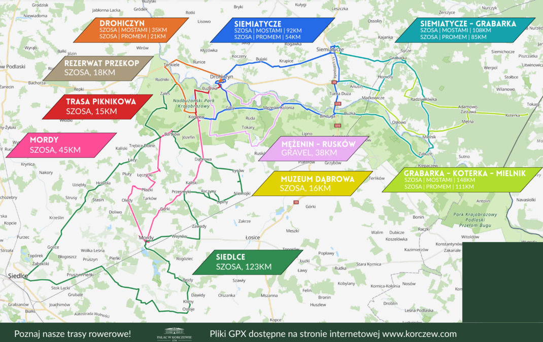 Wszystkie poniższe trasy rowerowe prowadzą po najciekawszych miejscach na Podlasiu Nadbużańskim. Trasy zostały podzielone na stopień trudności, typ roweru oraz długość. Każdą trasę można pobrać w pliku o rozszerzeniu .gpx