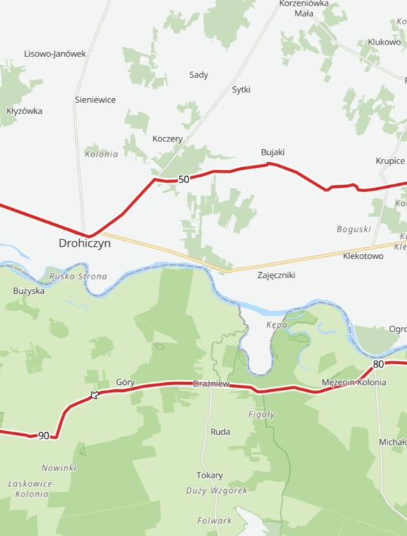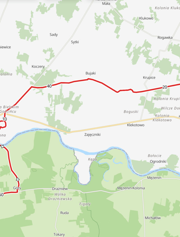Ta około 38-kilometrowa trasa gravelowa to propozycja dla miłośników spokojnych, terenowych wypraw z dala od ruchliwych dróg. Szlak prowadzi przez malownicze tereny nadbużańskie po stronie mazowieckiej, z przepięknym widokiem na Podlasie po drugiej stronie rzeki. Trasa wiedzie głównie polnymi drogami i dobrze utrzymanymi szutrami, momentami przebiegając przez leśne odcinki.