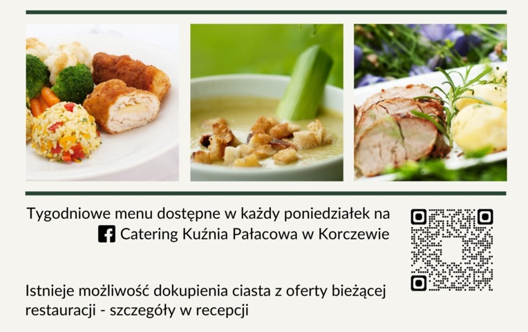Dla tych, którzy cenią sobie wygodę i komfort, restauracja pałacowa oferuje zestawy obiadowe na wynos lub z dowozem w promieniu 10 km od Korczewa.