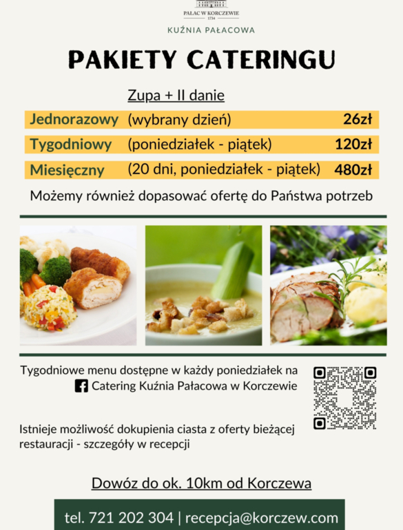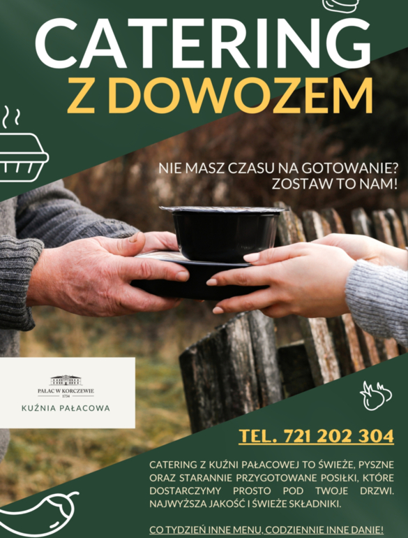 Dla Państwa wygody oferujemy dowóz w promieniu 10 km od miejscowości Korczew. Dania można również odebrać samodzielnie w Kuźni Pałacowej.