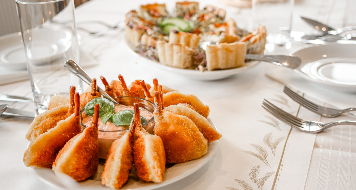 Catering na uroczyste przyjęcie tworzymy z lokalnych składników. Naszą specjalnością są m.in. faworki z karpia poławianego w pałacowych stawach oraz regionalny przysmak z tartych ziemniaków, czyli blacharz.